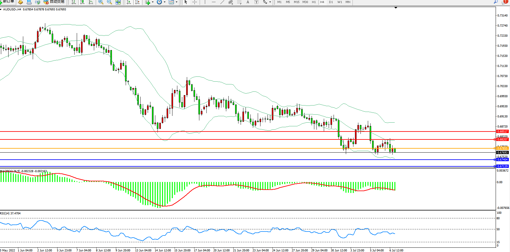澳元美元AUDUSD——4小时K线图显示: