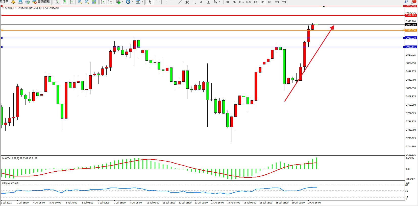 标普SP500——4小时K线图显示: