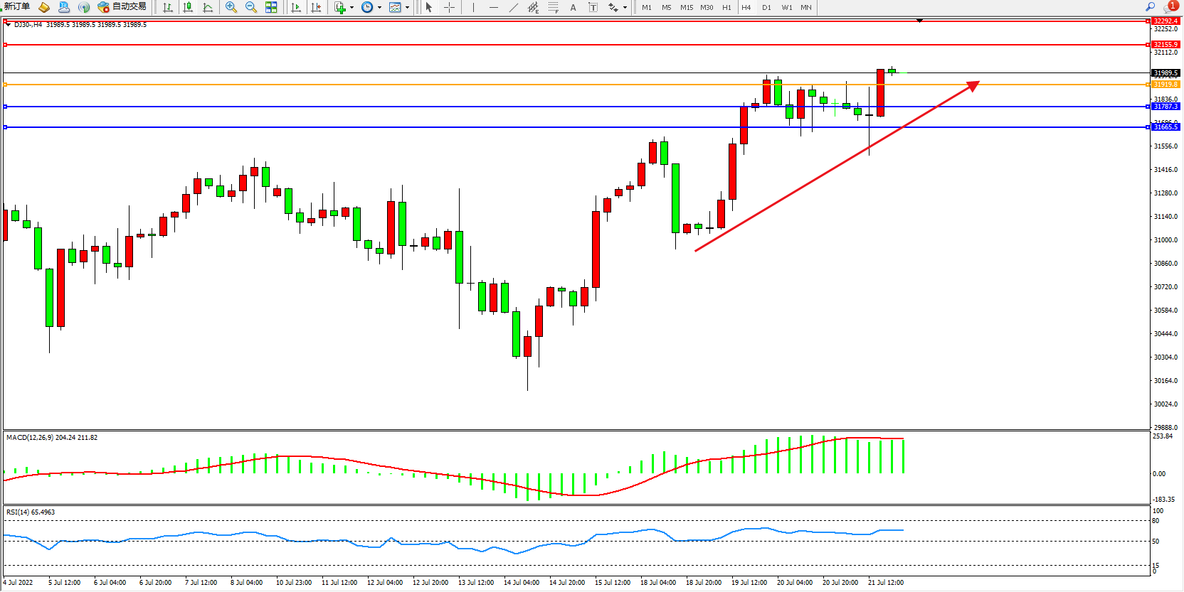 道琼斯指数DJ30——4小时K线图显示: