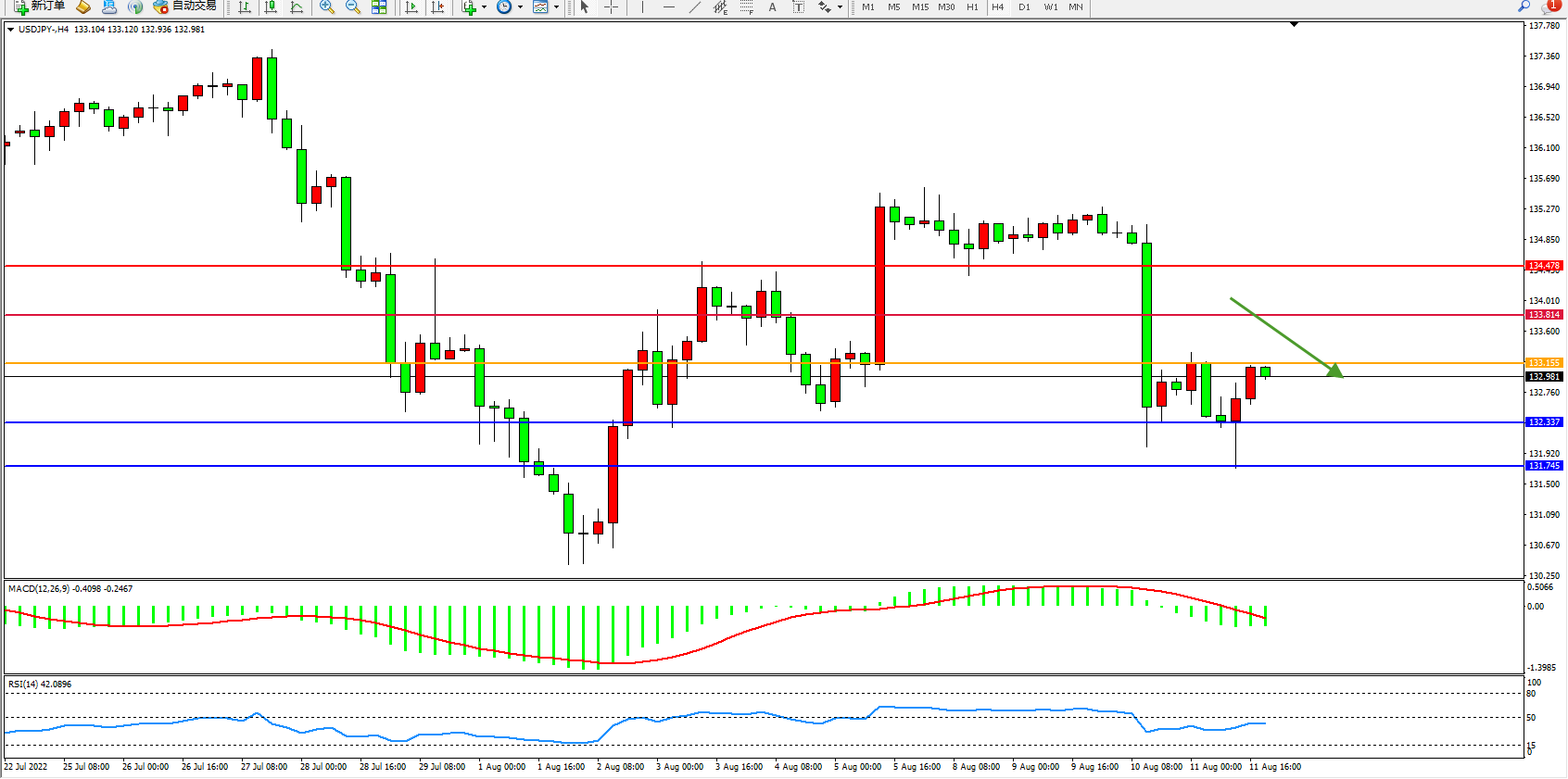 备选策略:133.155上方看涨,目标133.814、134.478