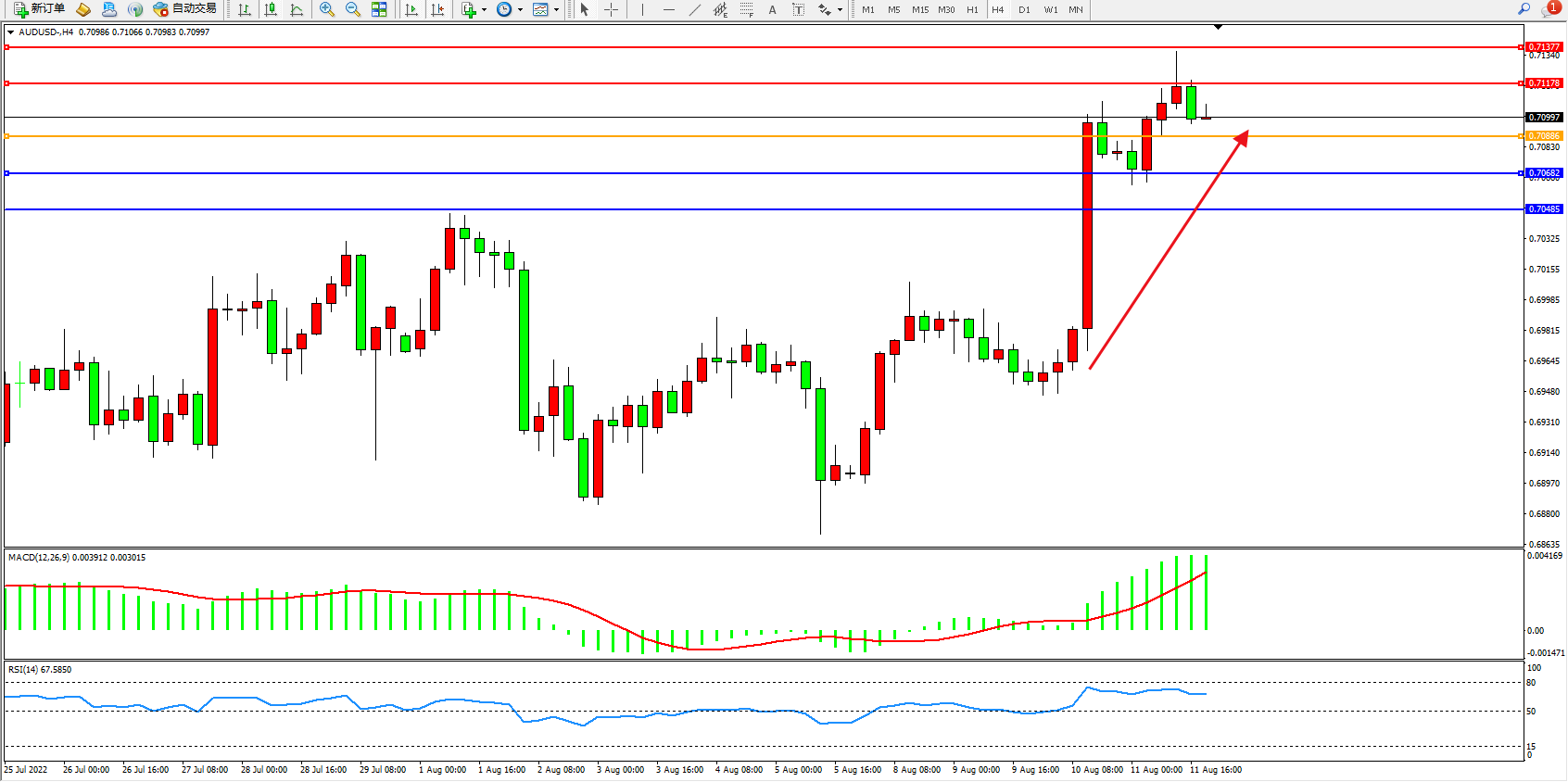 澳元美元AUDUSD——4小时K线图显示: