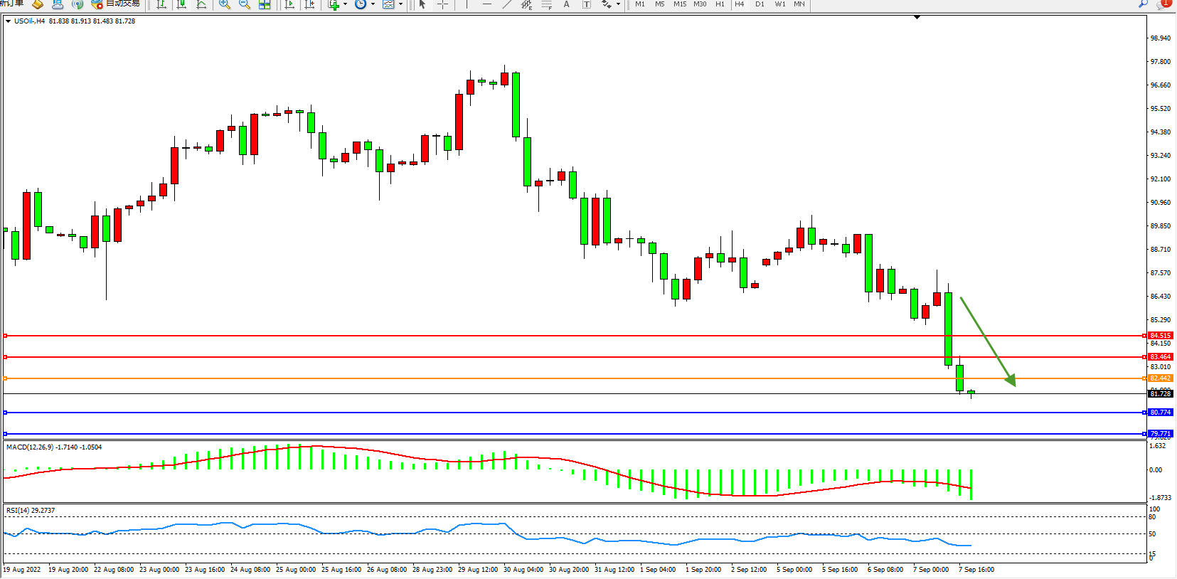 交易策略:82.442下方看跌,目标80.774、79.771