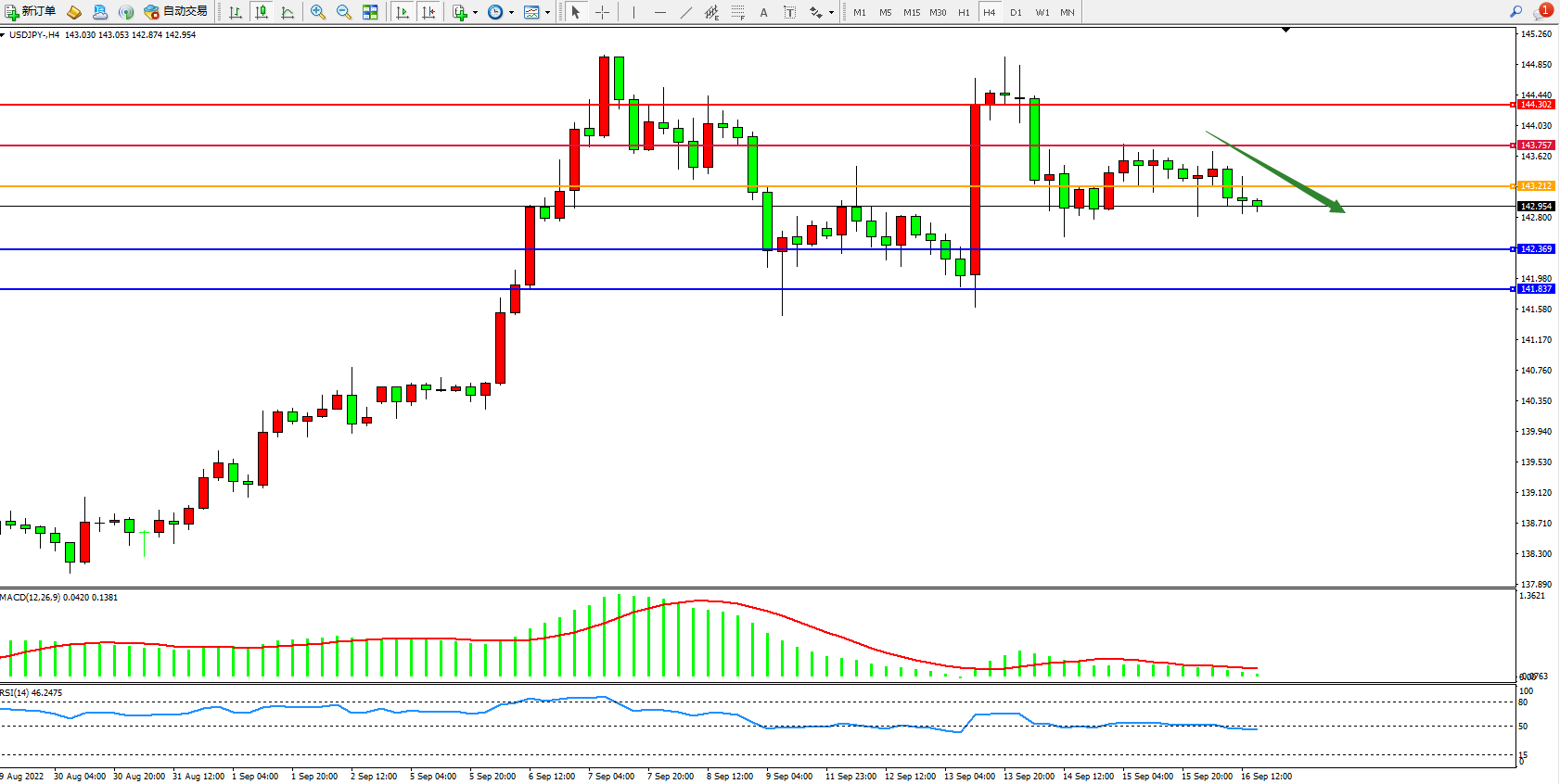 交易策略:143.212下方看跌,目标142.369、141.837