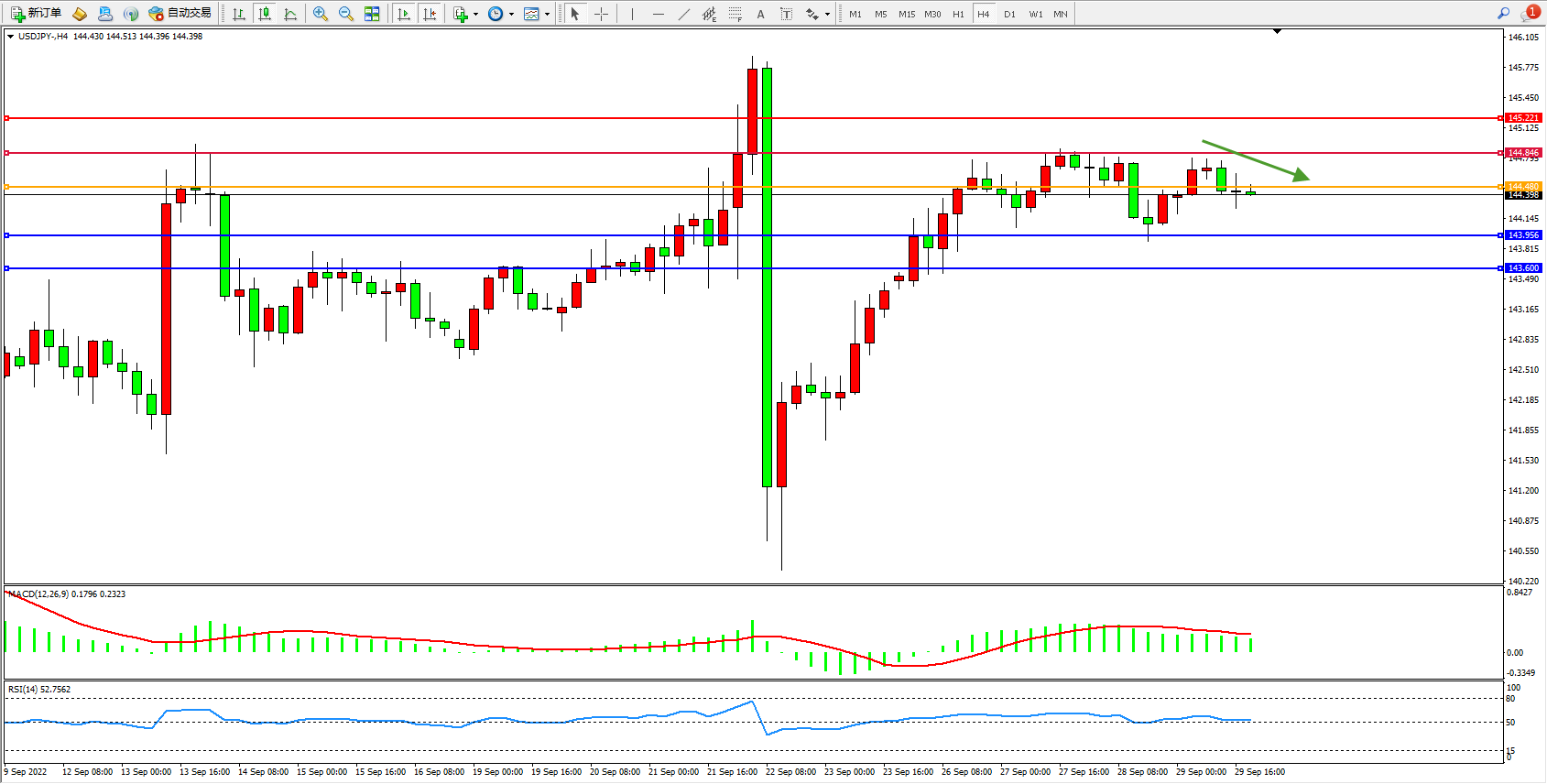 交易策略:144.480下方看跌,目标143.956、143.600