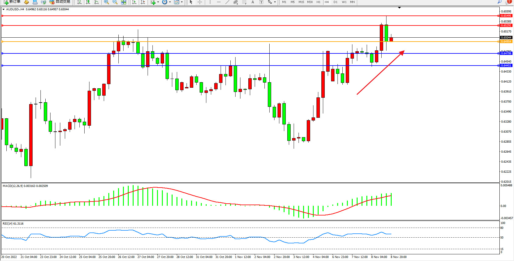 澳元美元AUDUSD——4小时K线图显示: