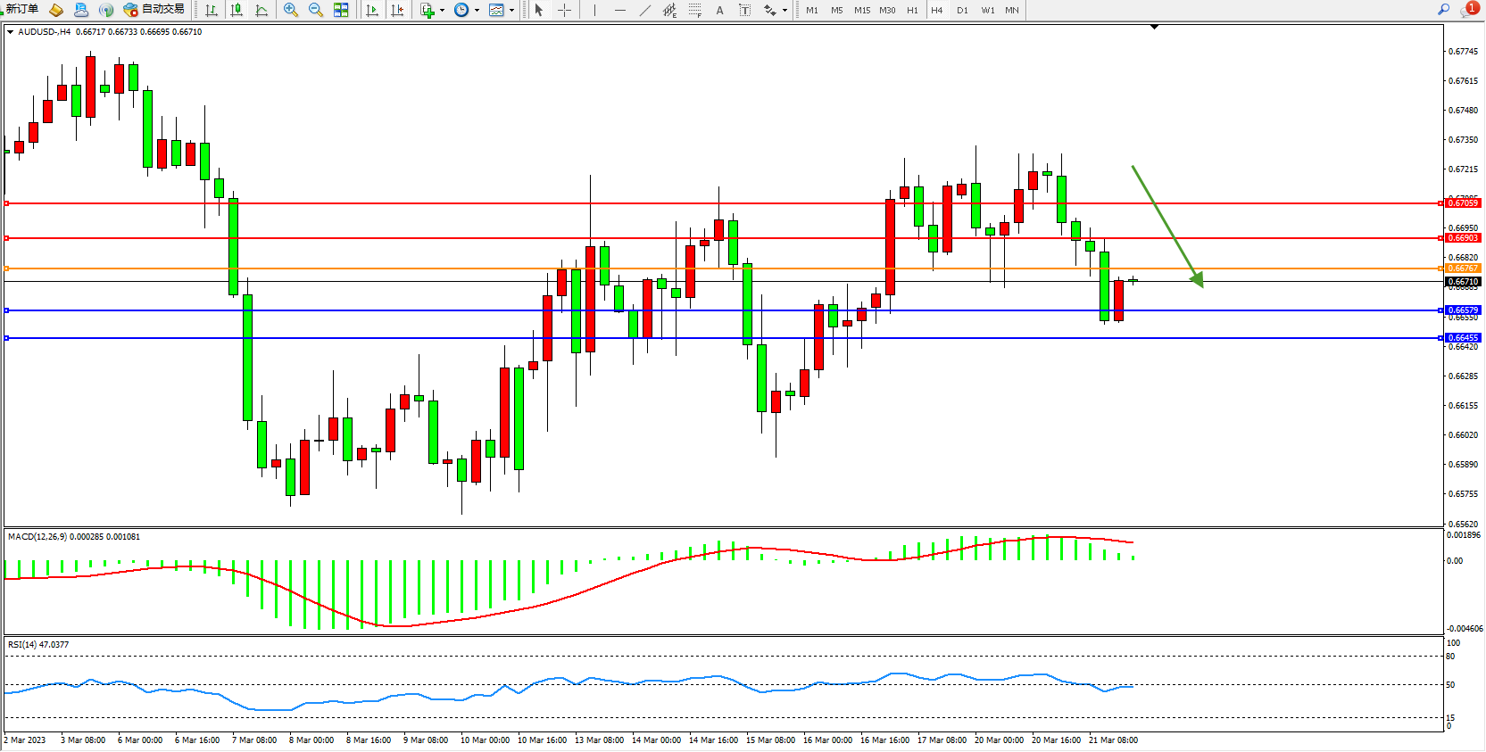 交易策略:0.66767下方看跌,目标0.66579 0.66455