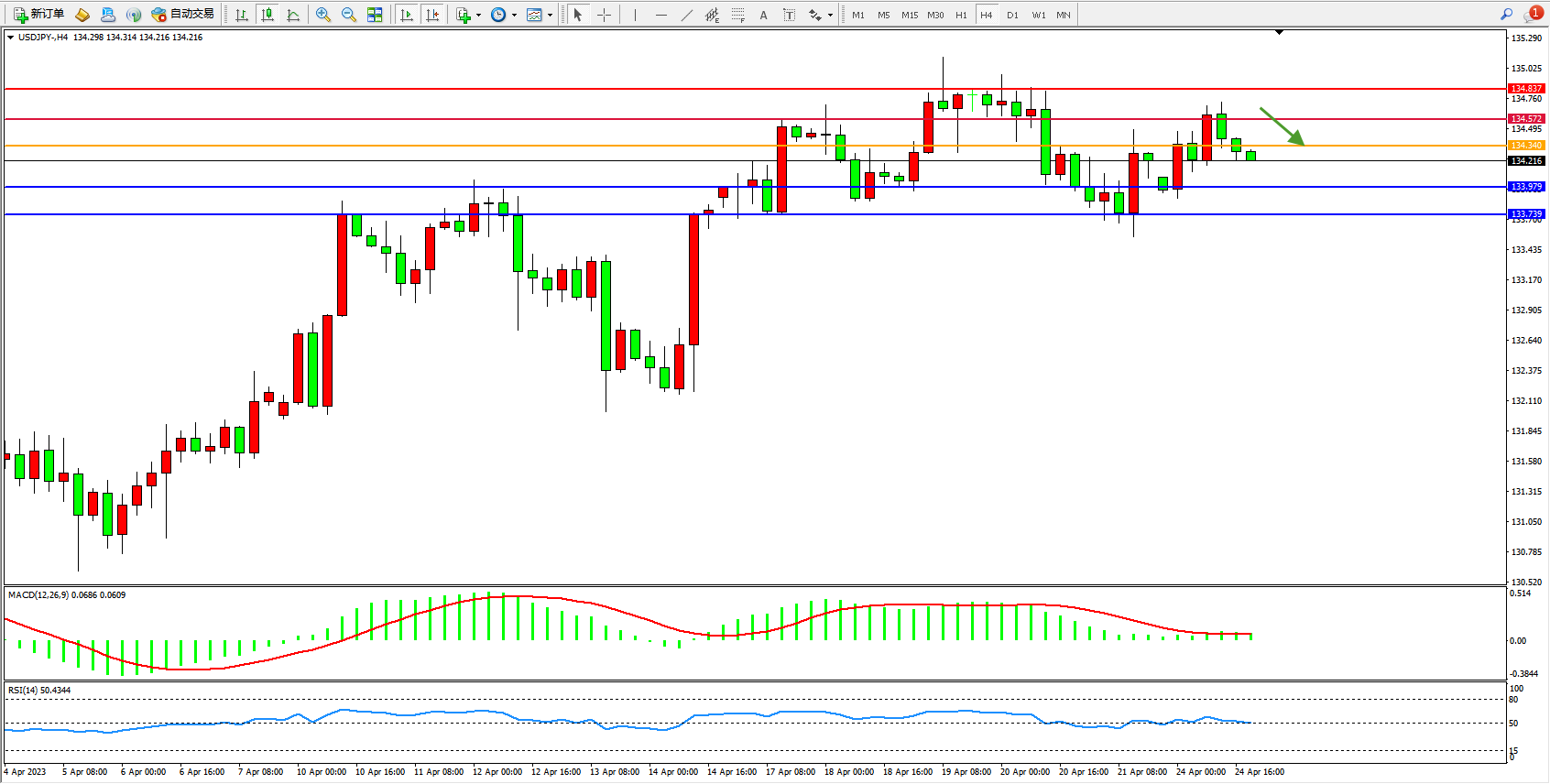 4小时图看:高位短期震荡,空头动力伺机入场,短期有继续回撤迹象,MACD指标处于0轴线上側徘徊,RSI指标处于50均衡线附近徘徊;