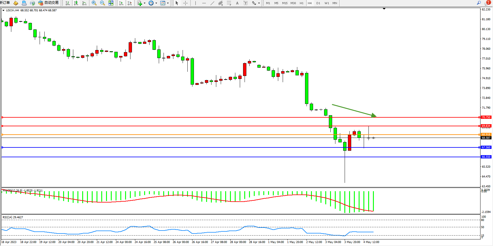 交易策略:68.918下方看跌,目标67.560  66.550