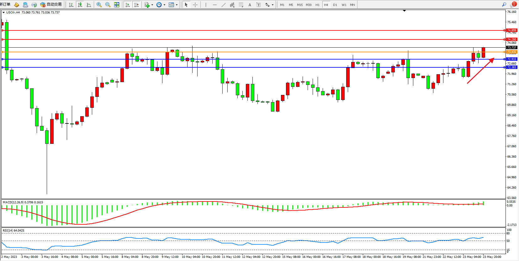 原油USOil——4小时K线图显示: