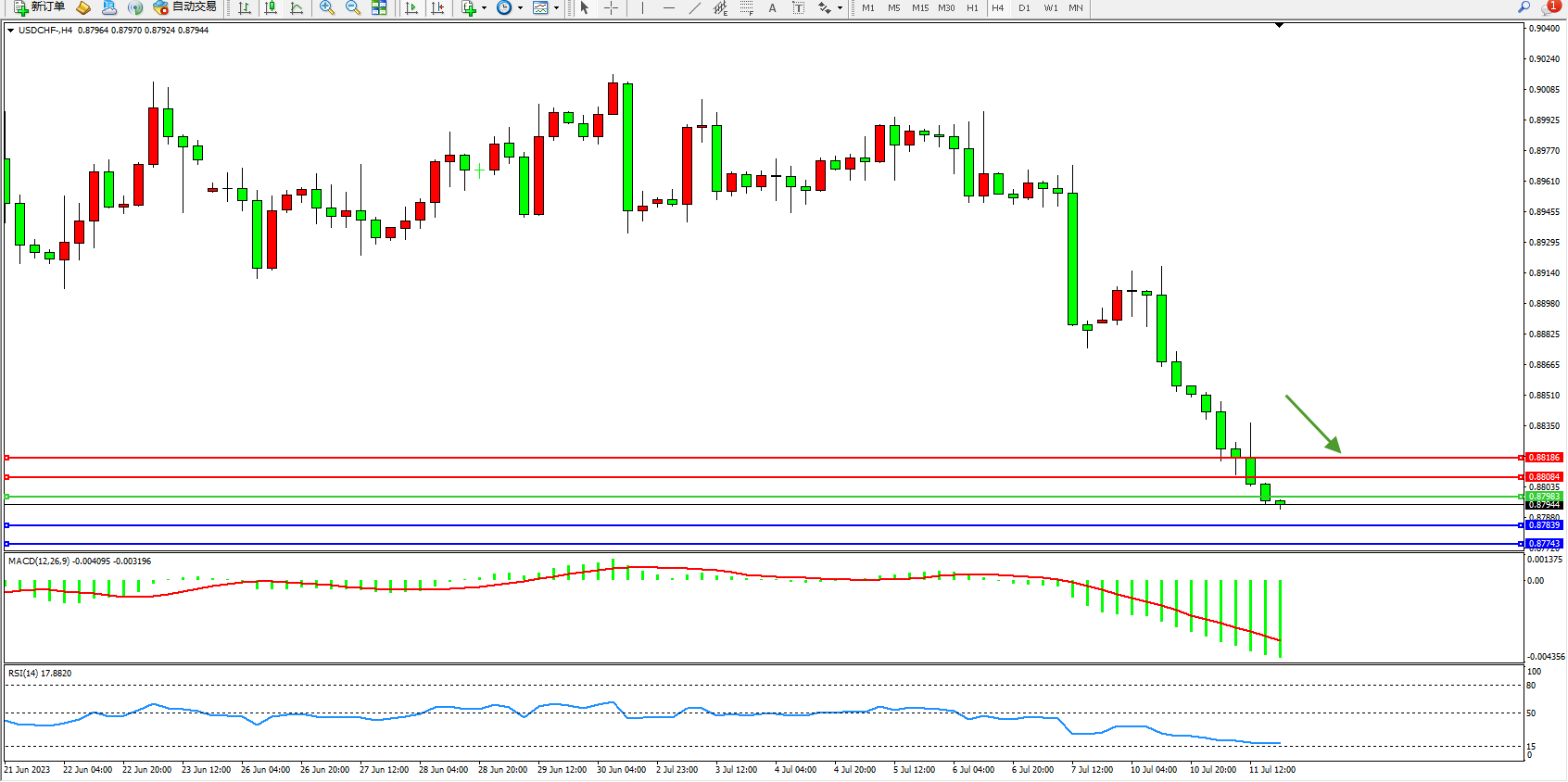 4小时图看:空头动力低位持续震荡下移,短期跌势未见止步,市场空头情绪笼罩,MACD指标处于空头区域持续下行,RSI指标处于空头区域低位超卖区15均衡线上側弱势震荡;