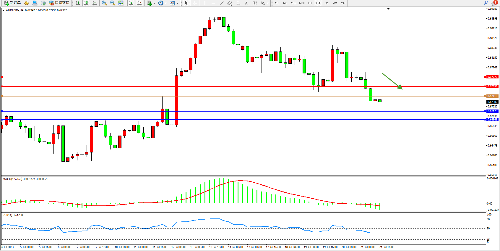交易策略:0.67410下方看跌,目标0.67123  0.66965