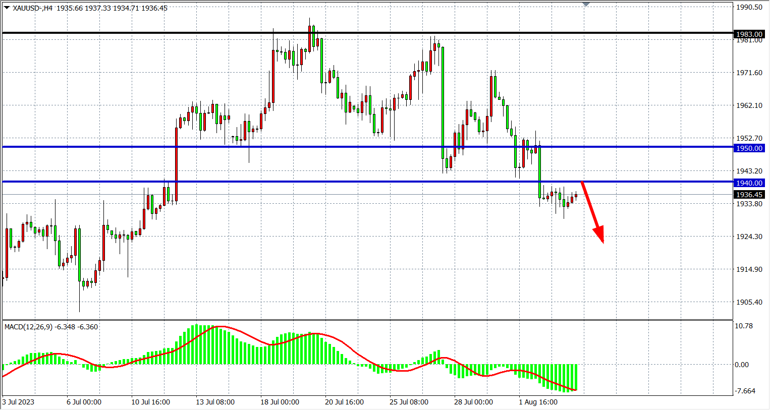 4小时图看,黄金于1940下方盘整,MACD量能在零轴下放量运行,行情走势延续空头,阻力下移1940-1955,下方支撑看1920-1900附近。