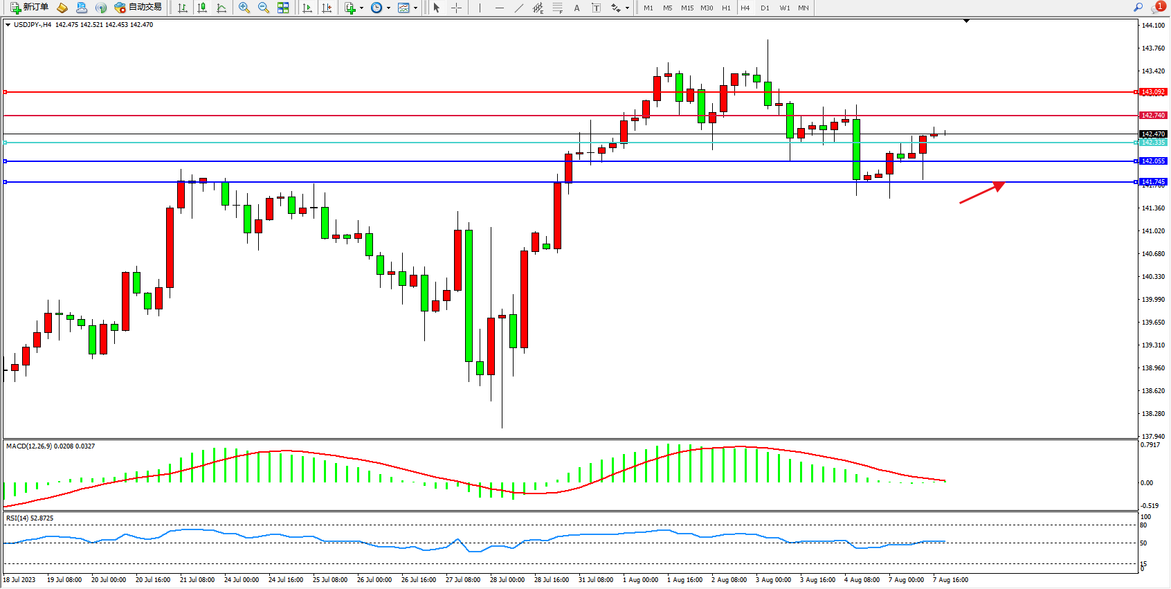 交易策略:142.335上方看涨,目标142.740  143.092