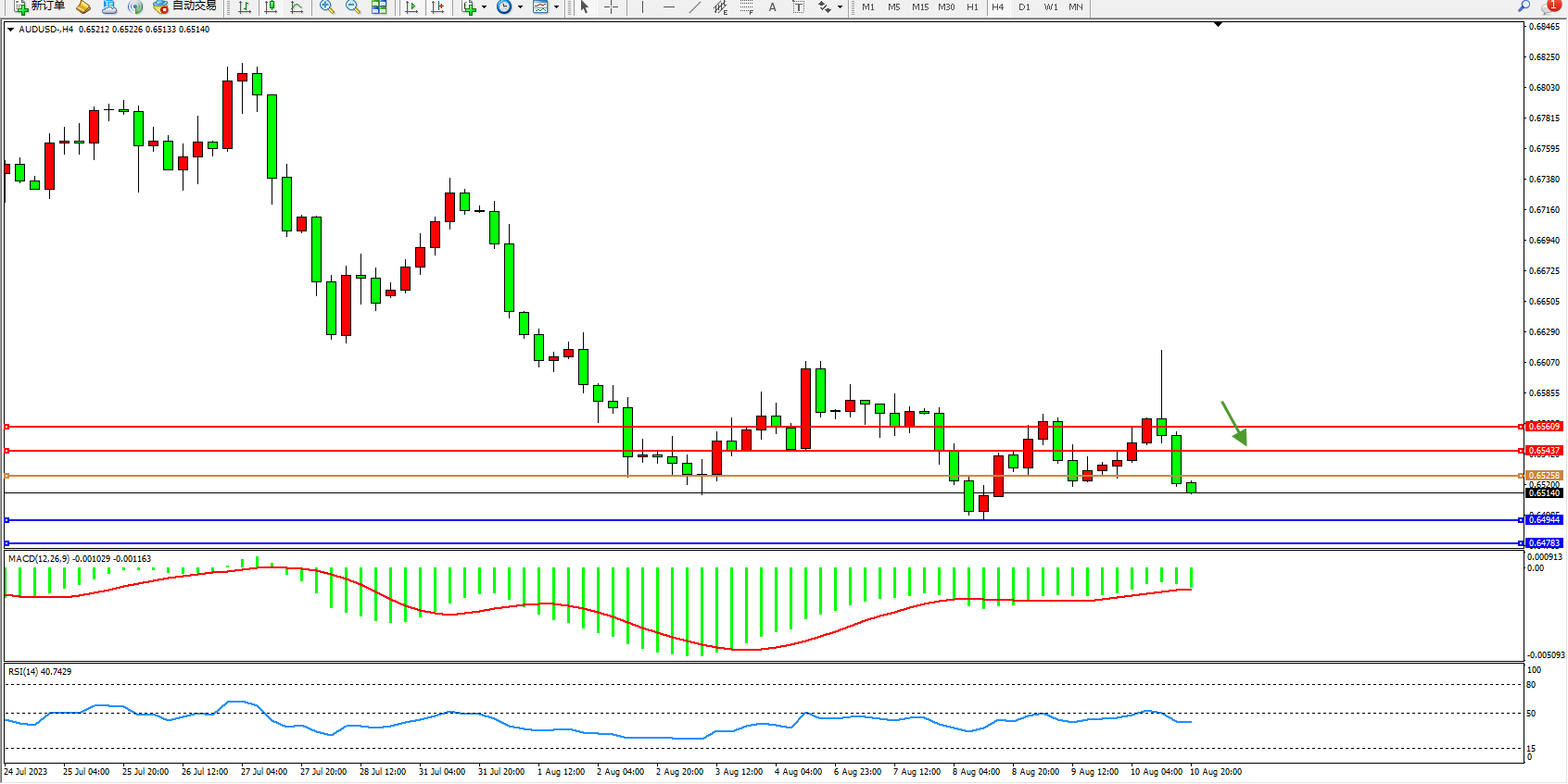 澳元美元AUDUSD——4小时K线图显示: