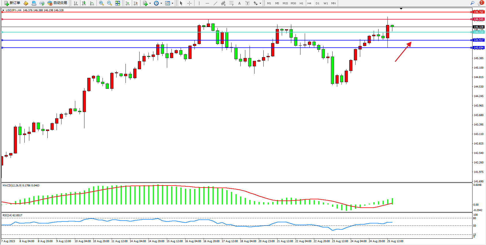 交易策略:146.328上方看涨,目标146.545  146.760