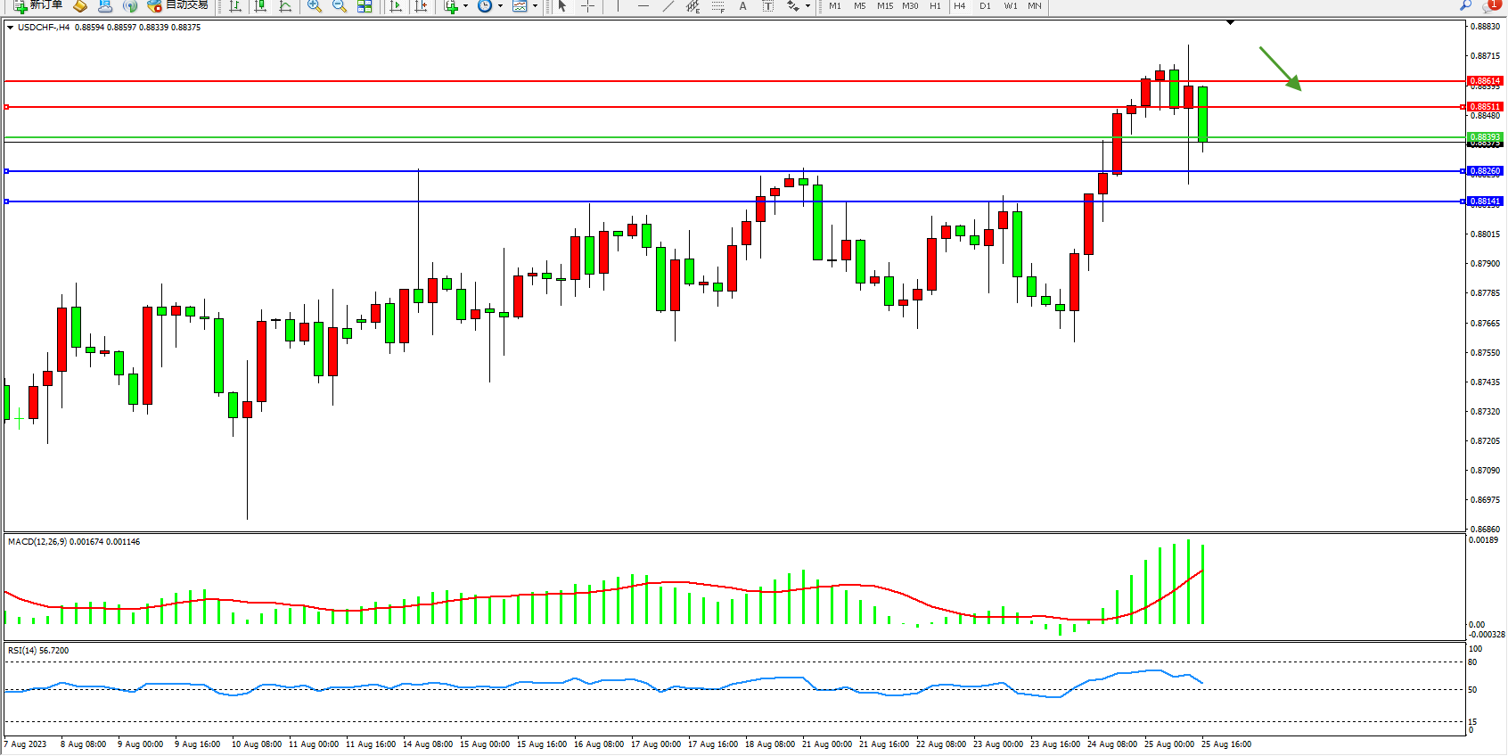 美元瑞郎USDCHF——4小时K线图显示:
