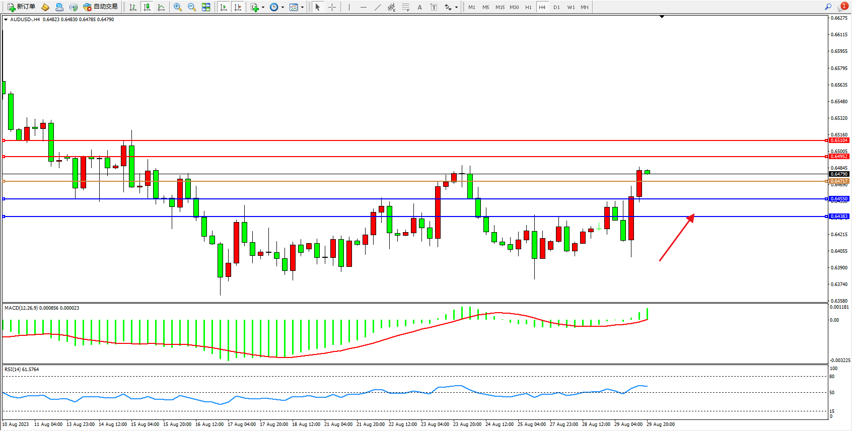 澳元美元AUDUSD——4小时K线图显示:
