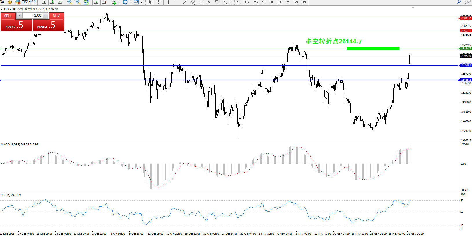 道琼斯指数DJ30—4小时K线图显示: