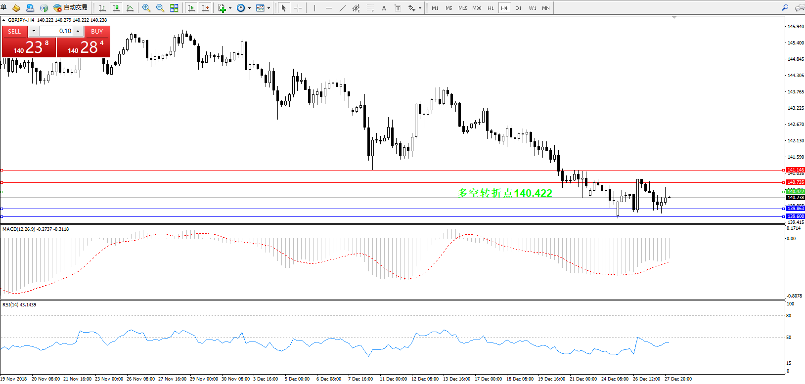 交易策略:140.422下方看跌,目标139.863139.600