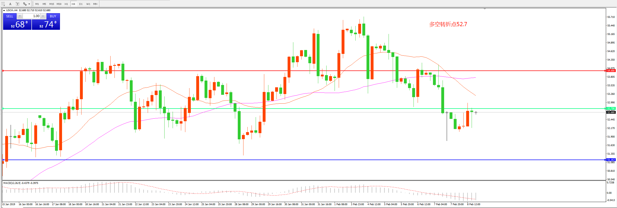 4小时图看,油价均线形成死叉后震荡下行,短期受制于52.7附近阻力, MACD绿柱增加,短期回落概率更大。