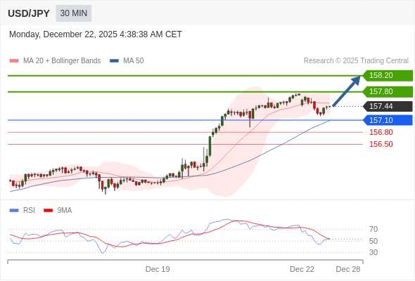 在 157.10 之上,看涨,目标价位为 157.80 ,然后为 158.20 。