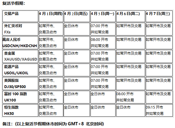 因应42(周五)欧美市场耶稣受难复活节假期及4月4日(周日)中国市场清明节假期,以下产品的交易将于假期期间休市,敬请知悉留意