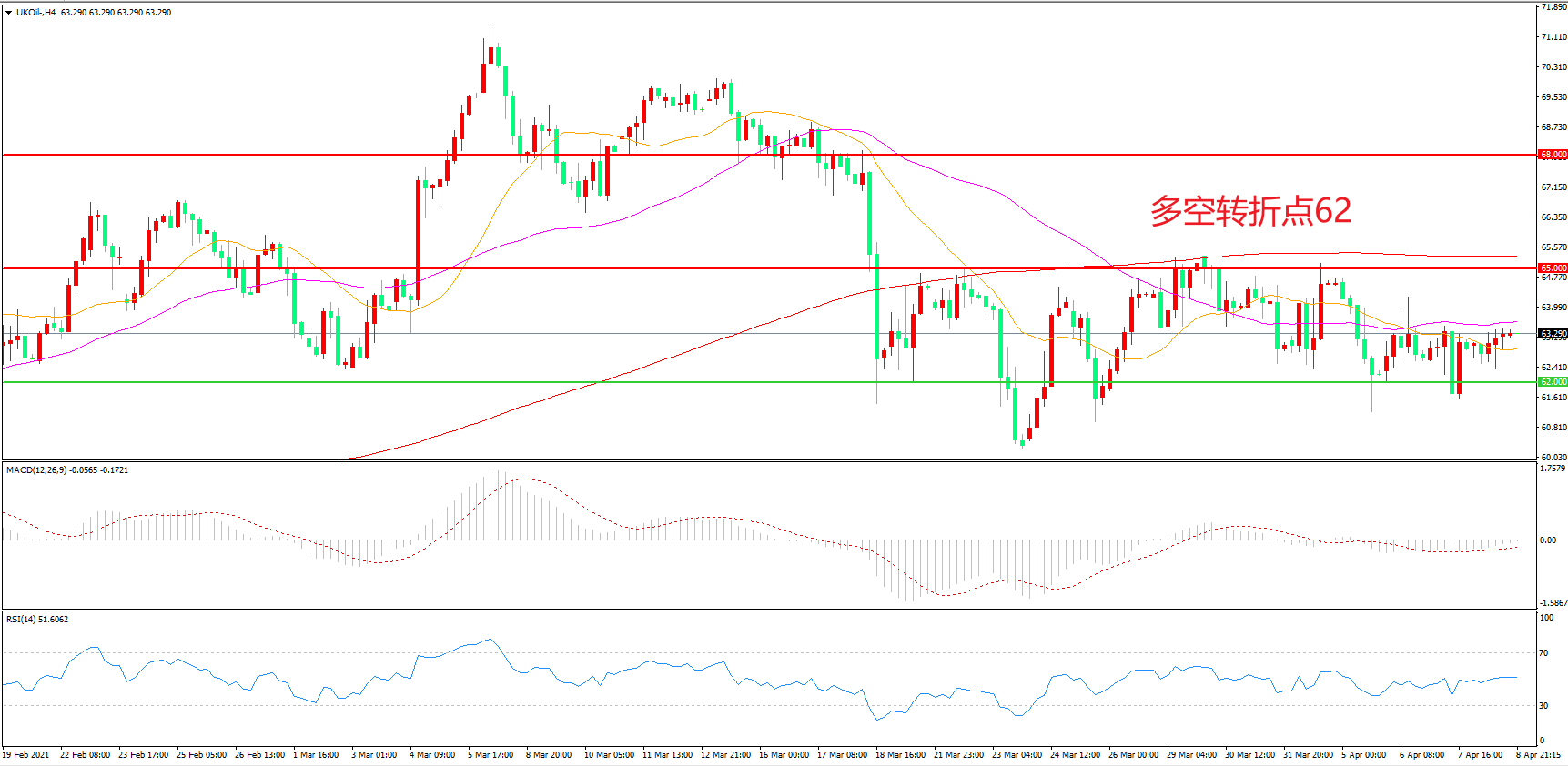 4小时图看,油价先跌后涨,区间震荡迹象明显,均线系统粘合形成上方阻力,62美元成为下方支撑,MACD绿柱缩短,RSI指标走平,日内延续下行概率较大。