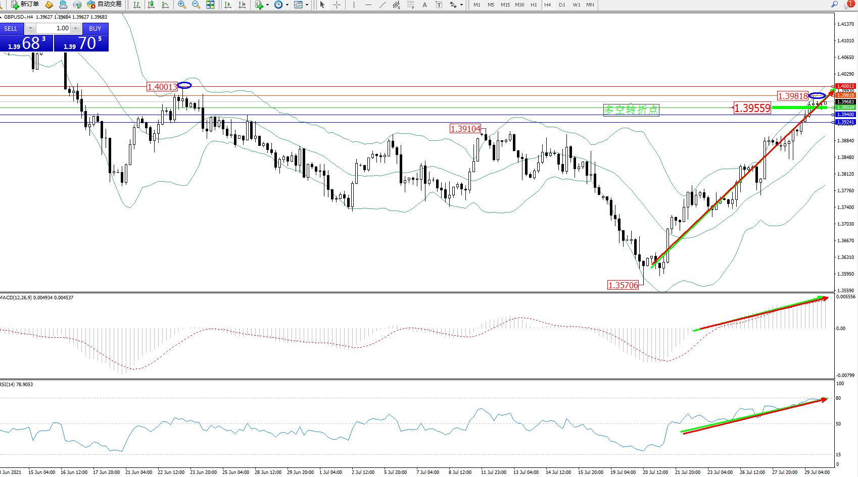 交易策略:1.39559上方看涨,目标1.39818、1.40013