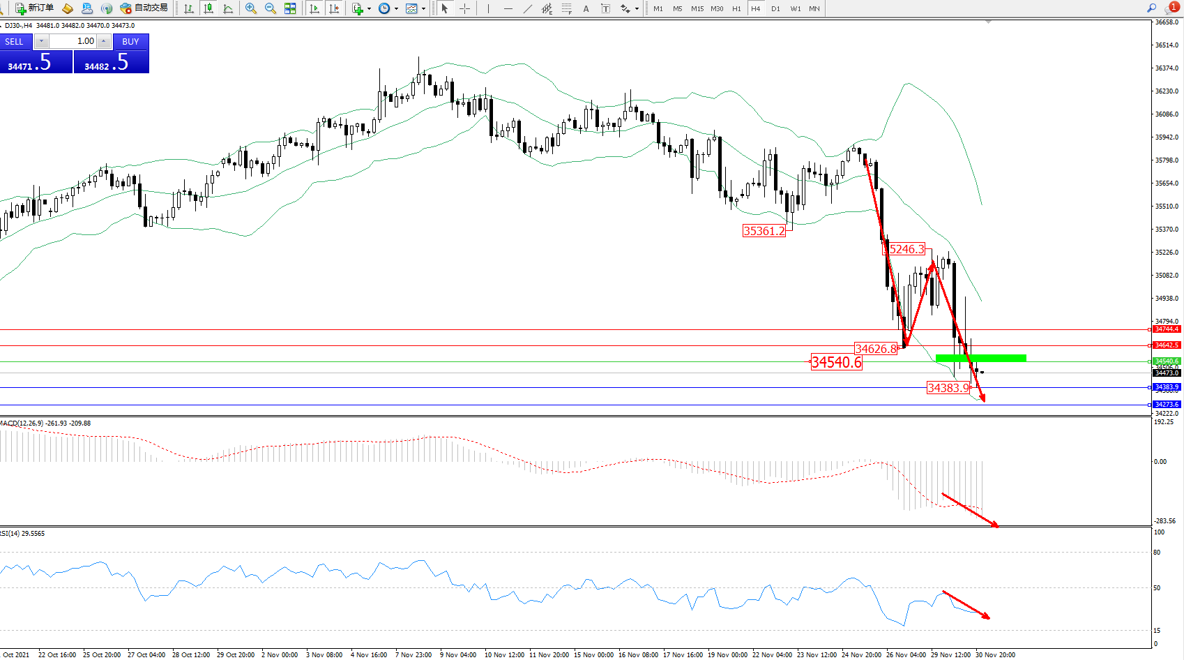 道琼斯指数DJ30——4小时K线图显示: