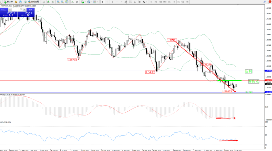 空头动力延续布林带指标通道中下轨区间持续震荡下行,短期空头动力抵达1.31609位置得到支撑整理回升,但整体下行趋势态势良好,低位回升或只是低位一次喘息,布林带指标呈向下移动趋势态势良好,低位呈收口走势中,上方压制关注1.34281附近,低位支撑关注1.31420附近,关注1.33033附近转折点,MACD指标处于空头区域维持整理平移,RSI指标处于50均衡线下方空头区域弱势徘徊中,如图: