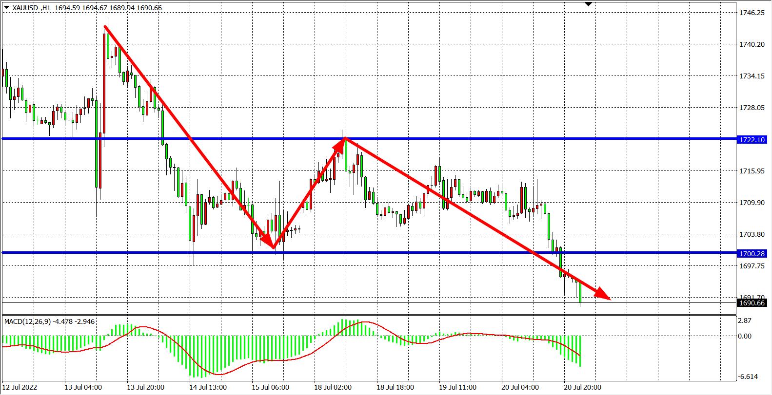 交易策略:在1700.00之下看跌,目标1685.00          1670.00
