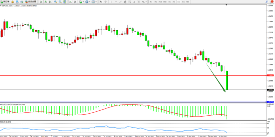 市场空头情绪笼罩,短期跌势未见止步,空头急速下挫,且有继续向下移动态势,上方压制关注1.11601附近,低位支撑关注1.05773附近,MACD指标处于空头区域维持震荡下移,RSI指标处于空头区域维持低位整理;如图: