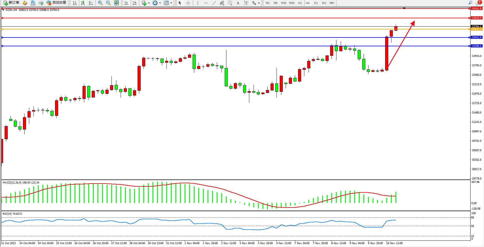 道琼斯指数DJ30——4小时K线图显示: