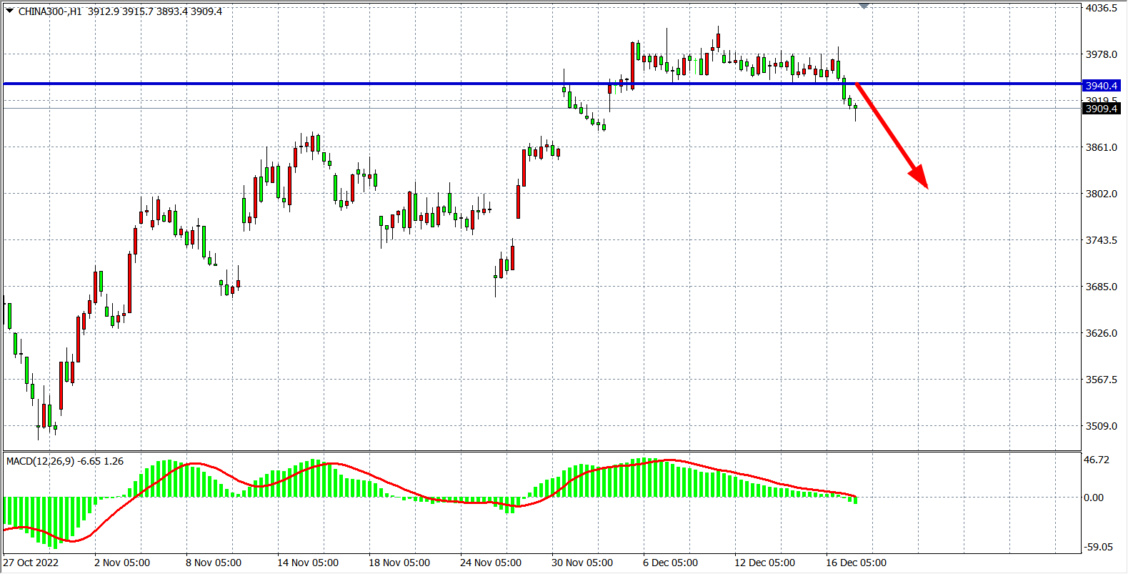 4小时图看,沪深3000在3970一线持续受阻后回落跌至3900附近,MACD于零轴之下出现小幅放量状态,显示行情进入调整走势,当前强支撑3940已转化为压力,在3940之下看空为主,下方看3880-3800附近。