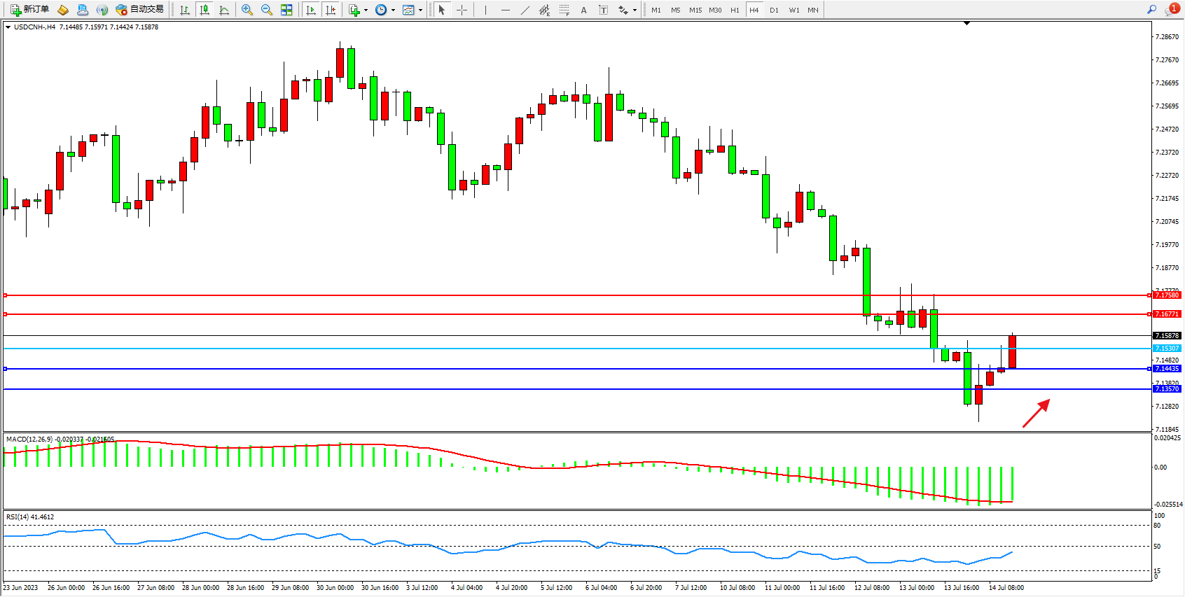 美元人民币USDCNH——4小时K线图显示: