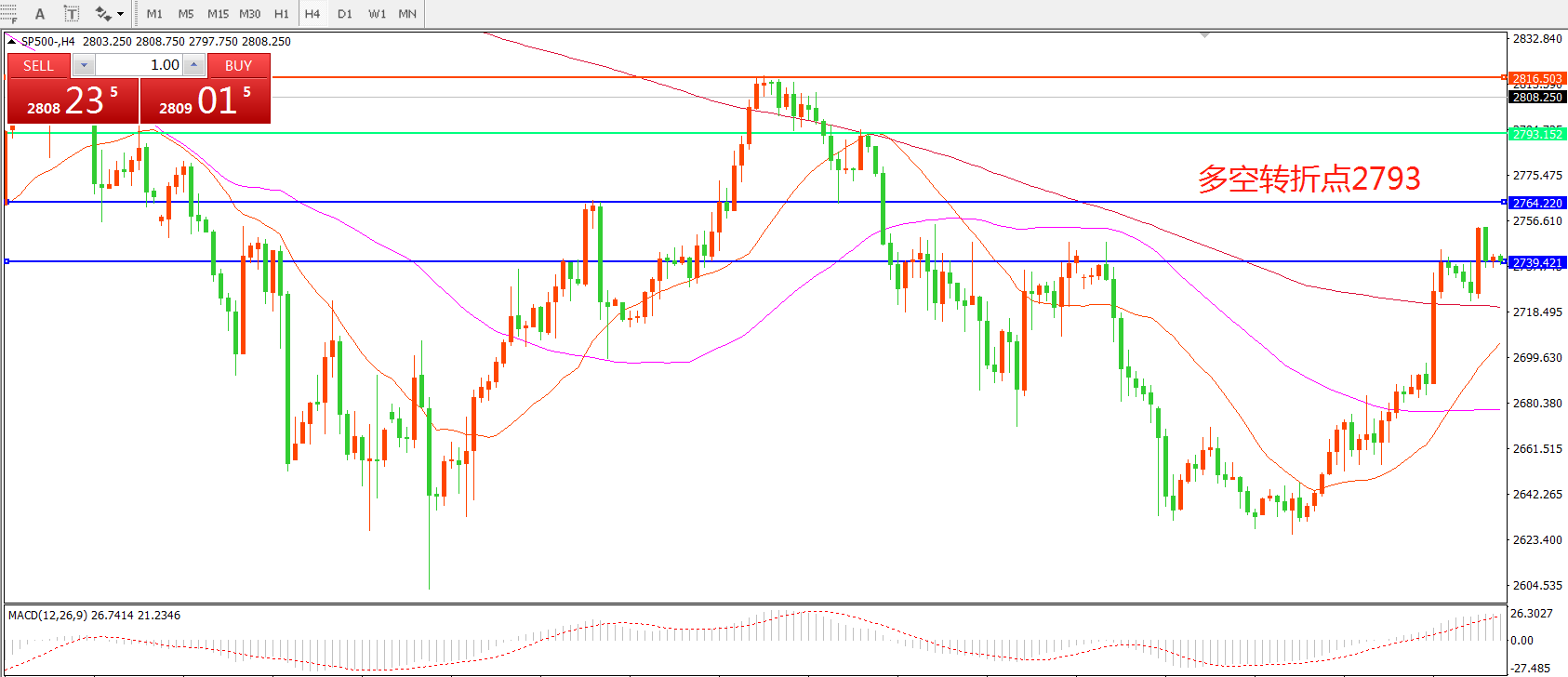 4小时图看,标普500突破阻力后快速连续拉升,前期阻力2793已成功站稳,短期走势偏强, MACD红柱增加,短期以逢低做多操作为主。